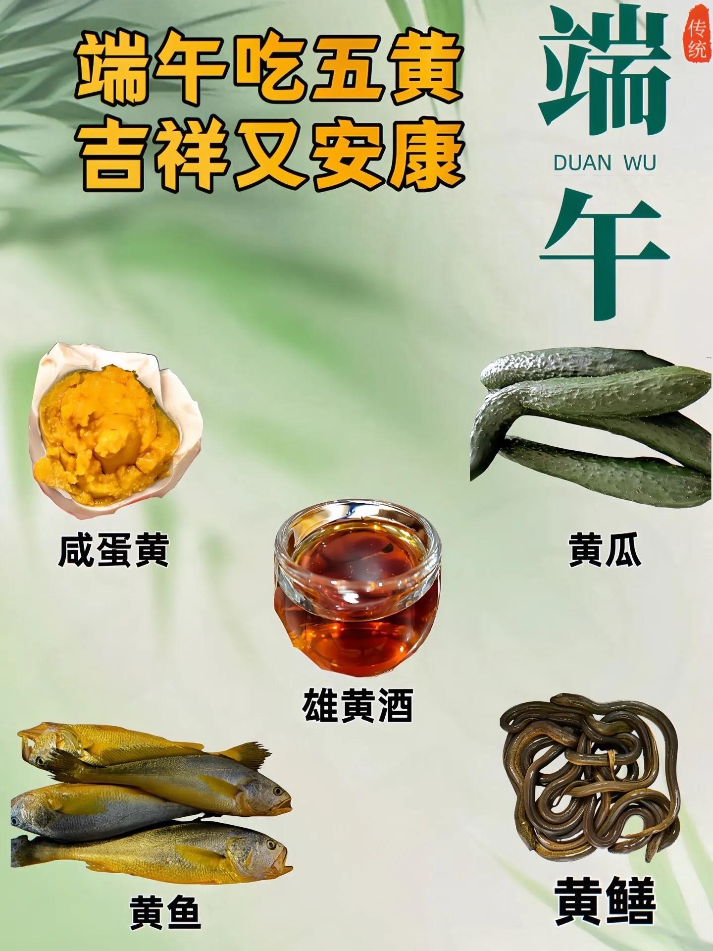 在端午節(jié),還有吃五黃的習(xí)俗,即黃魚、黃瓜、黃鱔、咸鴨蛋黃、雄黃酒。這些食物在端午時(shí)節(jié)食用,被認(rèn)為可以祛病防疫、增強(qiáng)體質(zhì)。