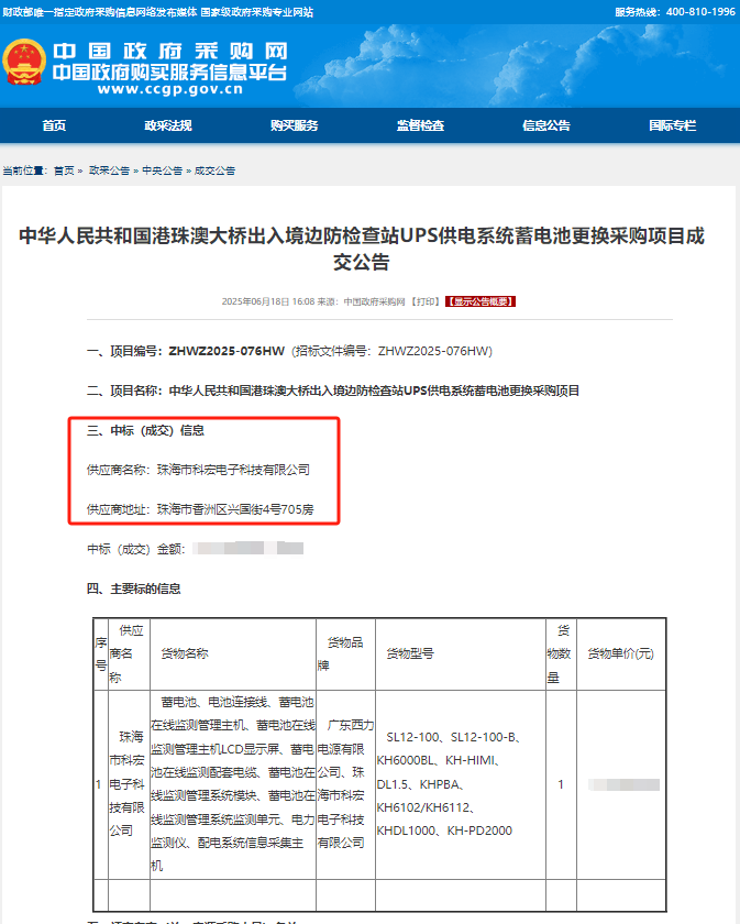 成功中標(biāo)“中華人民共和國(guó)港珠澳大橋出入境邊防檢查站UPS供電系統(tǒng)蓄電池更換采購(gòu)項(xiàng)目”。